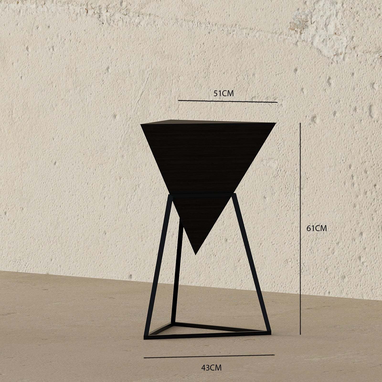 The Colson End Table features a geometric design with an upside-down triangular wooden top on a minimalist black metal frame. Its sleek, compact style makes it a functional and eye-catching addition to any living room or bedroom, perfect for displaying decor, books, or a small plant.